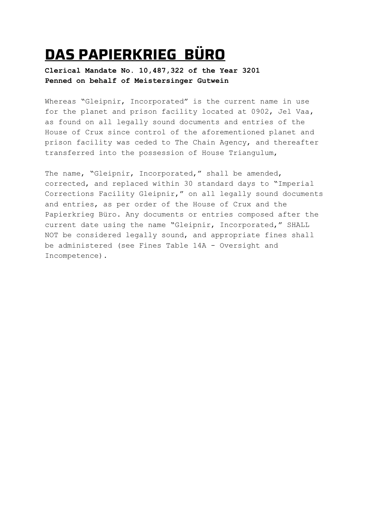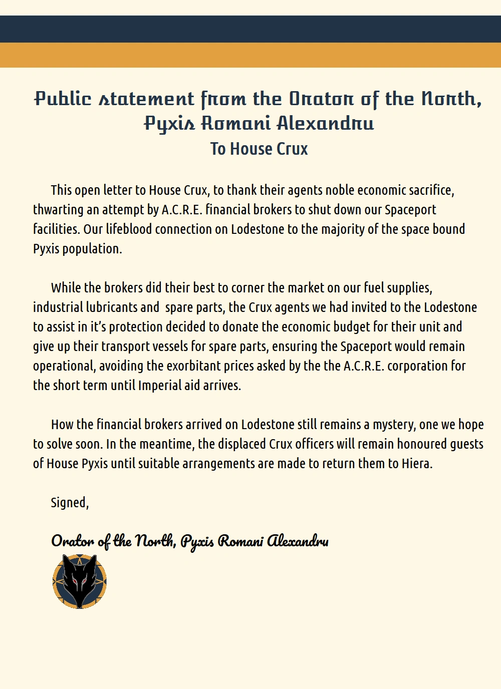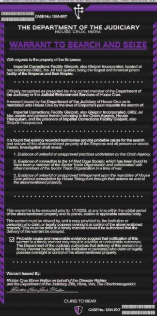 By the authority and Imperial justice of House Crux, we charge the ACRE Corporation and its directors with the following offences: —Conspiracy to inflict genocide on the population of Yakiyah —Treason by conspiring to unlawfully influence by force the election of the Imperial House —Extortion by threats of force against House Crux in support of the unlawful seizure of ICF Gleipnir —Extortion by threats of force against the Church of Humanity, Repentant for monetary gain We ask that you surrender yourselves to Imperial justice at once. Resistance will be met with the seizure and disposal of ACRE Corporation assets, and additional charges shall be brought. At this time we also call on members of the Sector Trade Organisation to suspend the ACRE Corporation's membership whilst law enforcement activities are ongoing. | |