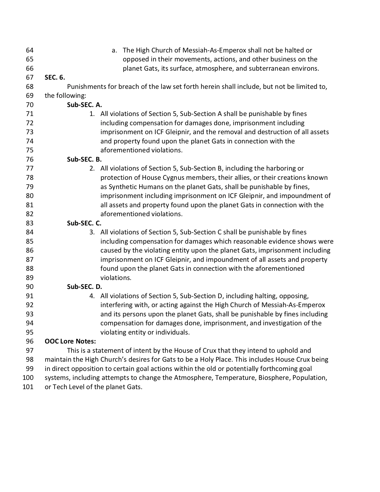 Amongst rising sector tensions, House Crux moved to seize the planet Gats, working with the Imperial Throne to declare the High Church's previous seizure illegal, but their intent commendable. House Crux put forward a number of new laws intended to uphold the High Church's holy missives while also providing legal backing to their intent to keep Gats a Holy Place. These laws were collectively titled "The Gats Proclamation." The Advance, a pro-Imperial political coalition already stationed on Gats, was to begin the paperwork necessary to bring in Crucian defenses and personnel to watch over the planet alongside the High Church clerics already present. The Advance focused their efforts primarily on Tezcat Station, a joint operation of the High Church of Messiah-As-Emperox and House Fornax, where they initially encountered resistance. However, through the quick work of the Advance and one Anwalt Dehvani Astrid, the price of the locally-operating Fornax Nobles was sussed out and paid, allowing the Advance to begin their initial efforts to take control of the Station and Gats itself. |