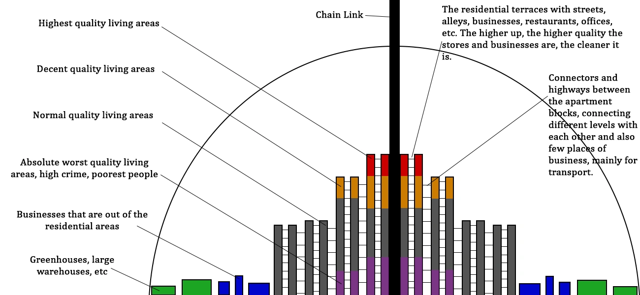 Seeing little natural light, having bad traffic connections and being the least well maintained, the lowest apartment blocks closest to the Link are usually inhabited by the poorest. Due to the horrible traffic opportunities, workers living in the depths of the cities need to leave hours before their work shifts start and will only come home after work well into the late evening.
