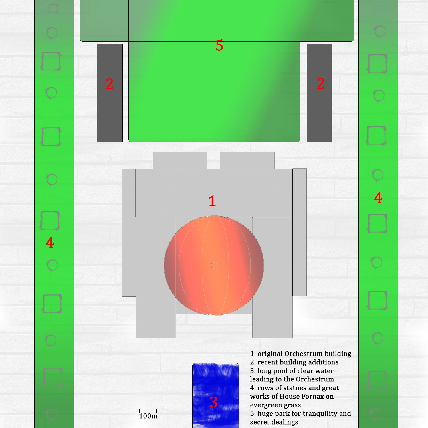 Over time the surrounding area of the Orchestrum was re-designed to fit the needs of the Senators more. A huge park called The Speaker’s Garden was built behind the main building, to allow peace and tranquility - and meetings in secret, without ears to overhear. Water and greenery were introduced, long rows of incredible Fornax engineering and artworks line the premise alongside evergreen grass, flowers, and trees from all over the sector. In front of the Senate Hall’s main entrance is a long pool of incredibly clear water. Many senators wash their hands in it before their first or an important session in a symbolic gesture of clean consciousness.