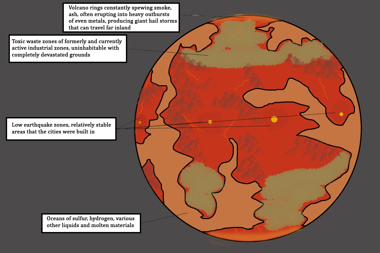These barren wastelands are home of most of the heavy industry that remains on the planet’s surface. The amount of minerals in the earth in these vast and mostly flat landscapes invited the human settlers to dig, mine and refine. In the process and over the centuries the grounds became poisoned with byproducts of the industrial activity, making them completely uninhabitable. Seismic activity is strong in these regions, especially around certain coastlines, and so early colonists were forced to give up trying to found settlements in these regions at the latest after the war (see below under Colonization history).