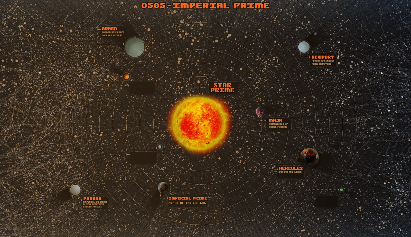 The planet Newport got its name from the old idea that the ice giant should be used as an anchor point for travellers going in and out of the Imperial Prime system, aeons ago. House Fornax and the rulers of Imperial Prime at that time (which can’t be dated back exactly, as it was pre Scream) allegedly built a large space station orbiting the planet, trying to make traders use it as a forced stopping point before going to Imperial Prime (planet) or Maja.