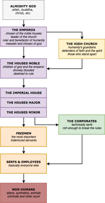 The Empire has a strict hierarchy that every citizen is judged by, it is most commonly called the "Chain of Being." Not everyone agrees with this though and are actively fighting against this structure, but as a whole it influences everyone's daily lives.
